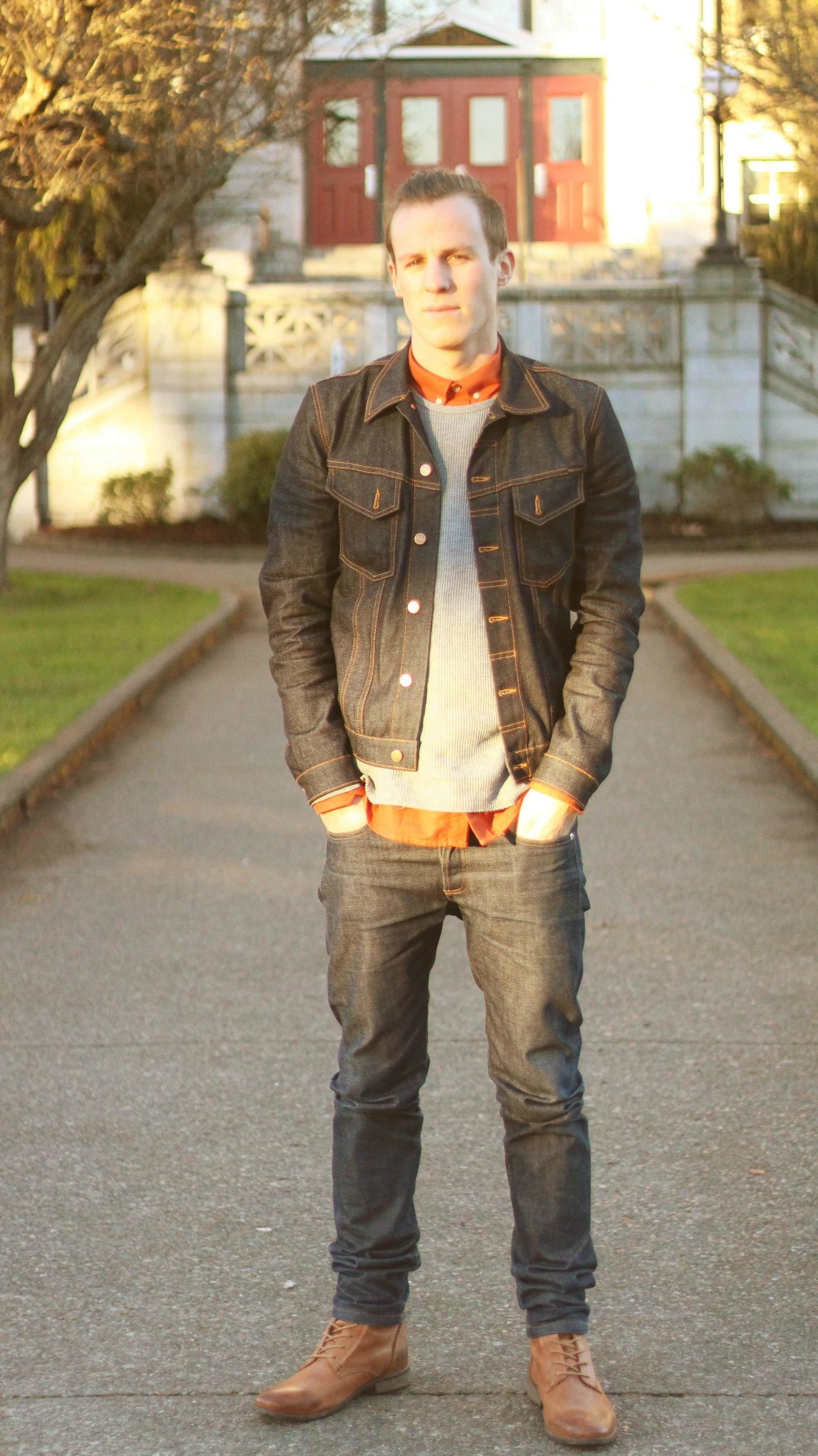 him- jacket/nudie, shirt/club monaco, button up/minimum, jeans/apc, boots/shoe the bear